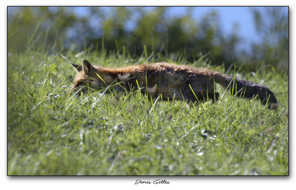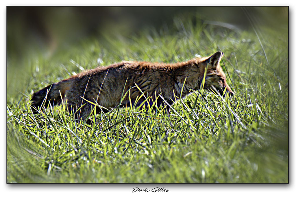 Je ne suis pas fier de mes photos. Manque évident de netteté.Trop loin, dans une lumière contrastée et moi dans une position plus qu'instable à plat-ventre sur une bute haute de 2 mètres qui séparait le champ de la route sur laquelle je me trouvais, je glissais sans cesse en tentant de me hisser. Difficile de shooter en déséquilibre complet. Je ne cherche pas d'excuses. Ce sont malheureusement les faits. C'est à bord de mon véhicule que je l'ai aperçu en train de muloter. Le temps de pouvoir me garer, de sortir du véhicule, de me saisir de l'appareil photo, vous imaginez la transe dans laquelle je me trouvais. Tout cela en me faisant le plus discret possible, vite revenir 50m en arrière où je l'avais aperçu en roulant. Il était toujours là, imposant, enfonçant son museau dans les hautes herbes...